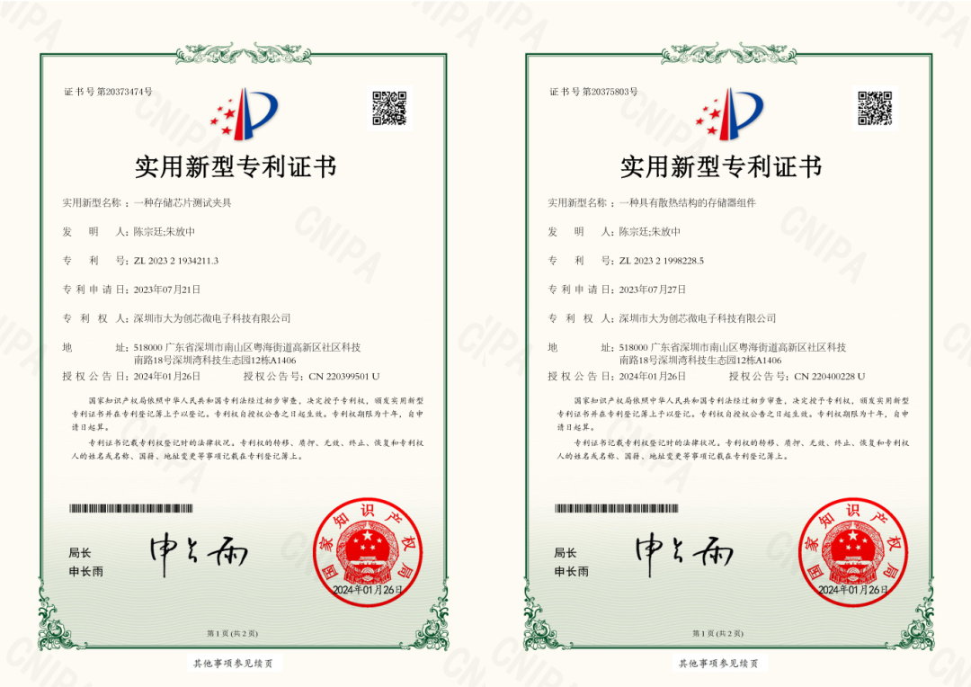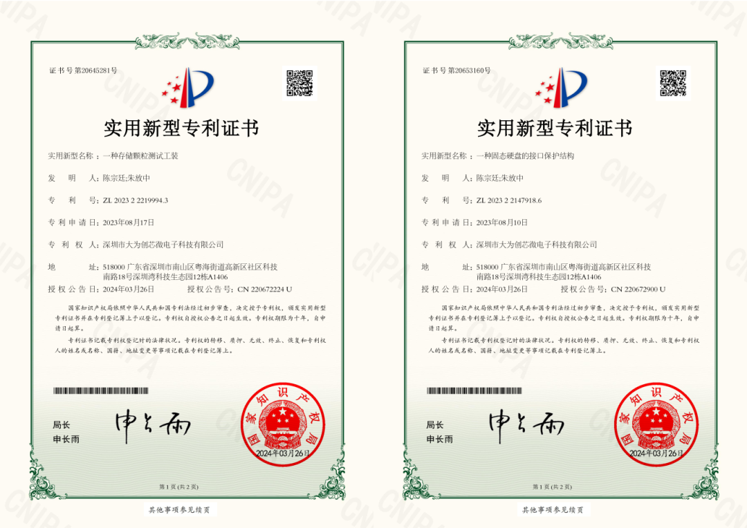 (2)大為股份子公司大為創(chuàng)芯申請(qǐng)的《一種一體式觸摸屏及電子設(shè)備》(專利號(hào):ZL 2023 2 1682334.2)、《一種存儲(chǔ)芯片測(cè)試夾具》(專利號(hào):ZL 2023 2 1934211.3)、《一種具有散熱結(jié)構(gòu)的存儲(chǔ)器組件》(專利號(hào):ZL 2023 2 1998228.5)、《一種存儲(chǔ)顆粒測(cè)試工裝》(專利號(hào):ZL 2023 2 2219994.3)和《一種固態(tài)硬盤的接口保護(hù)結(jié)構(gòu)》(專利號(hào):ZL 2023 2 2147918.6)實(shí)用新型專利榮獲國(guó)家知識(shí)產(chǎn)權(quán)局授權(quán)。