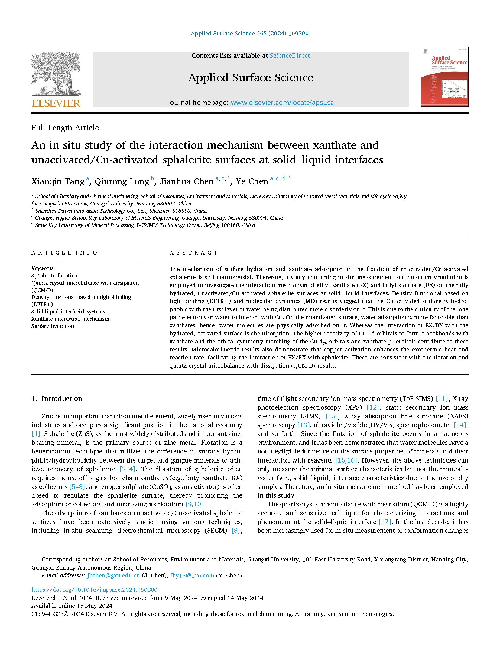 近期,深圳市大為創(chuàng)新科技股份有限公司(以下簡(jiǎn)稱“大為股份”、“公司”)郴州鋰電新能源產(chǎn)業(yè)項(xiàng)目(以下簡(jiǎn)稱“大為股份郴州鋰電項(xiàng)目”)采選基地研發(fā)團(tuán)隊(duì)負(fù)責(zé)人龍秋容博士與廣西大學(xué)在讀博士研究生唐瀟琴等人攜手合作,在國(guó)際知名SCI一區(qū)期刊《應(yīng)用與表面科學(xué)》上成功發(fā)表了題為《未活化/銅活化閃鋅礦表面與捕收劑黃藥固液相互作用機(jī)理的原位研究》的論文。該研究深入剖析了閃鋅礦在不同活化狀態(tài)下的表面性質(zhì)以及其與黃藥(一種常用硫化礦物捕收劑)之間的固液相互作用機(jī)制。