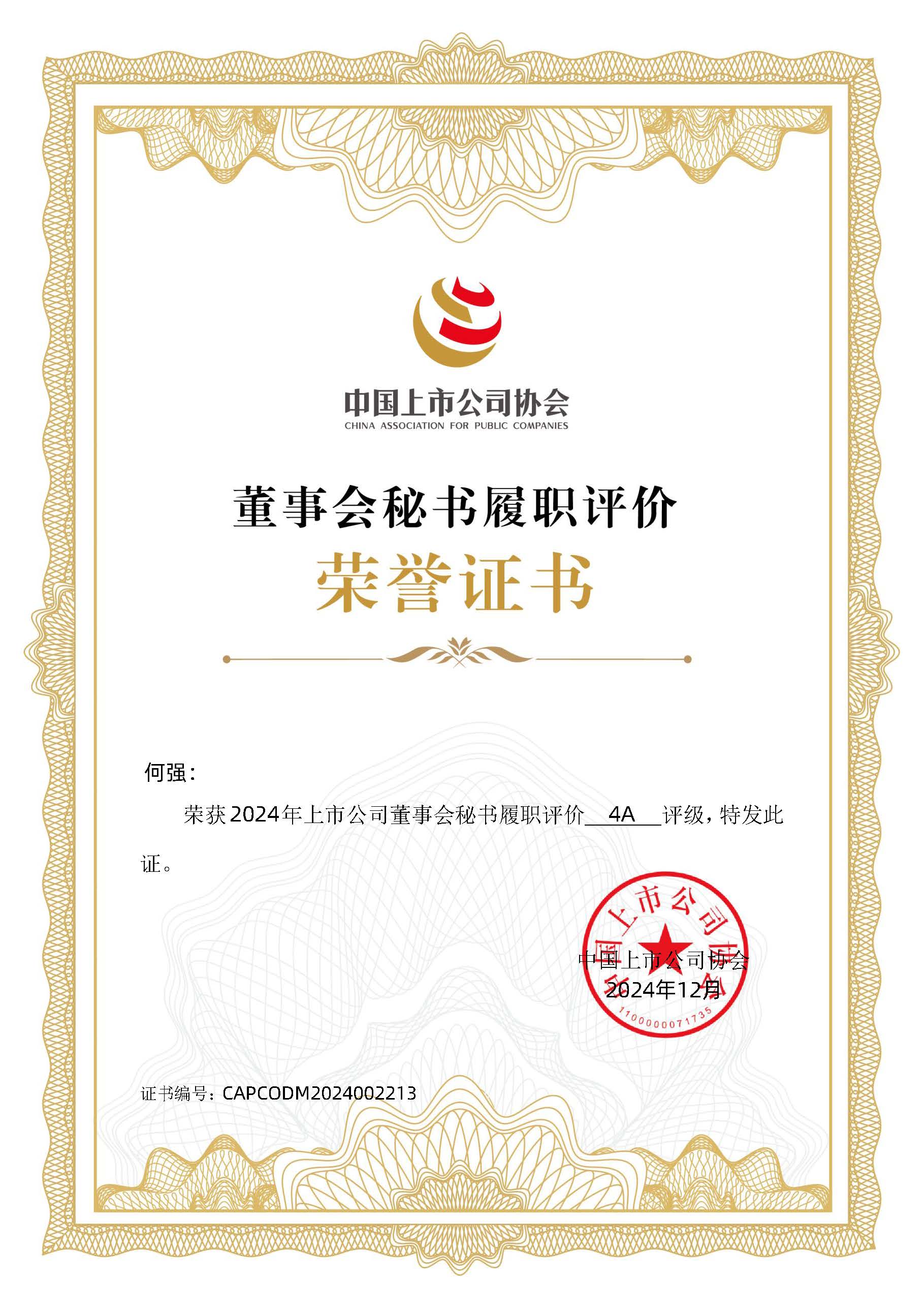 “2024上市公司董事會秘書履職評價”證書