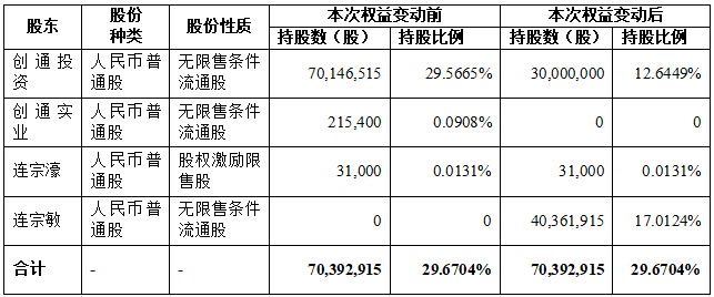 本次權(quán)益變動前后,連宗敏女士及其一致行動人創(chuàng)通投資、創(chuàng)通實(shí)業(yè)、連宗濠先生持有公司股份的情況如下: